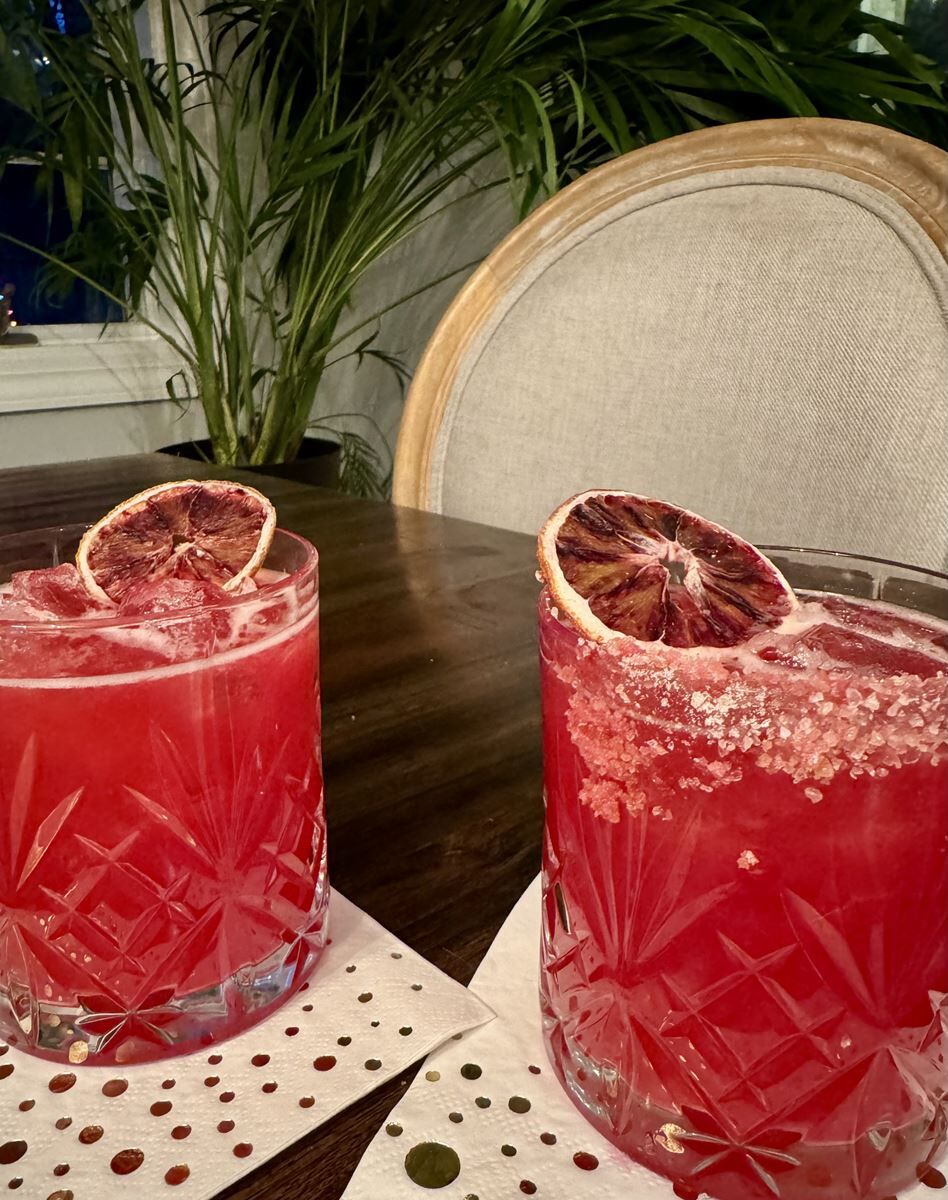 • Remove glasses from freezer and pour strained mixture over ice in glasses